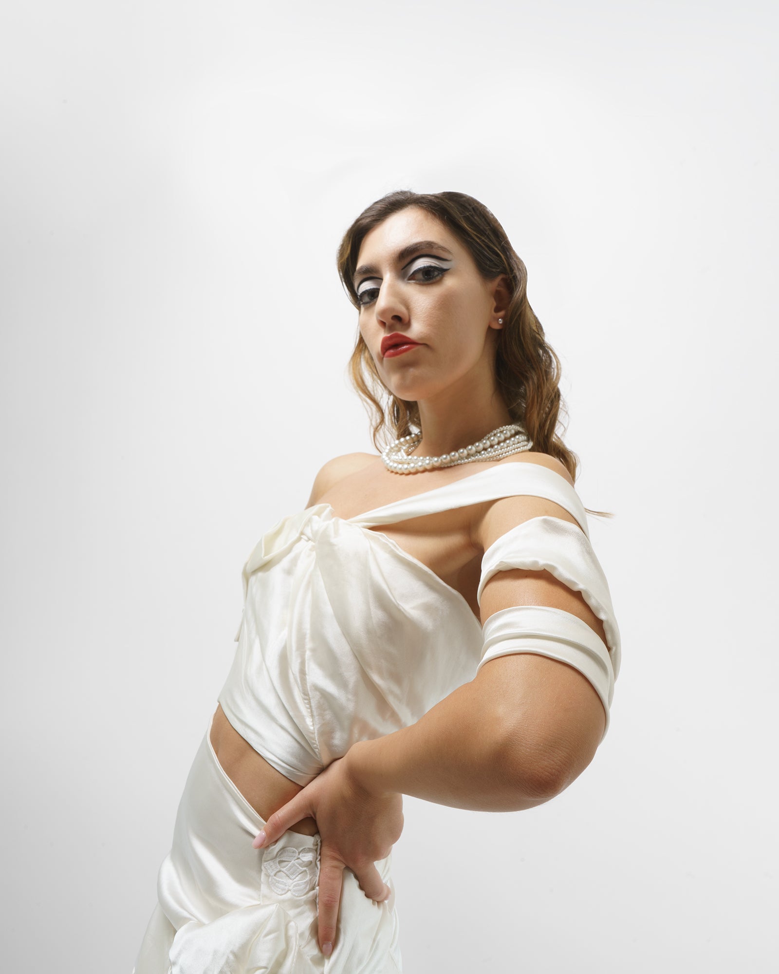This asymmetrical twisted top is 100% silk. Thanks to its wire you’ll be able to wrap it up around your arm in a creative way. For a complete look we recommend to buy the Cannes white silk skirt from eauddo SS24.
